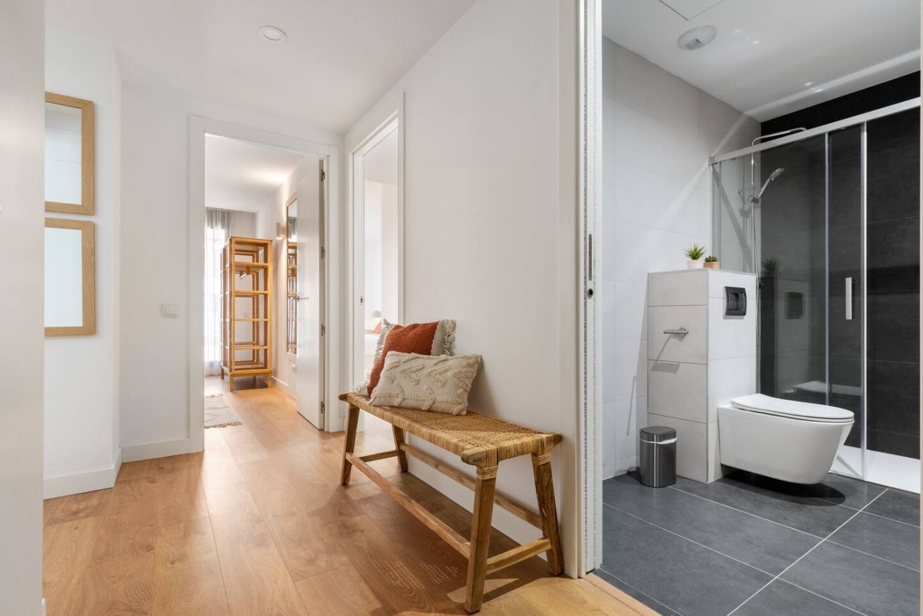 Este apartamento de 70 m² tiene dos dormitorios con una cama doble y una individual, un baño, salón y cocina semiabierta completamente equipada. Es perfecto para nómadas corporativos o profesionales que necesitan espacios totalmente equipados y comodidades modernas. Máx. 3 huéspedes.