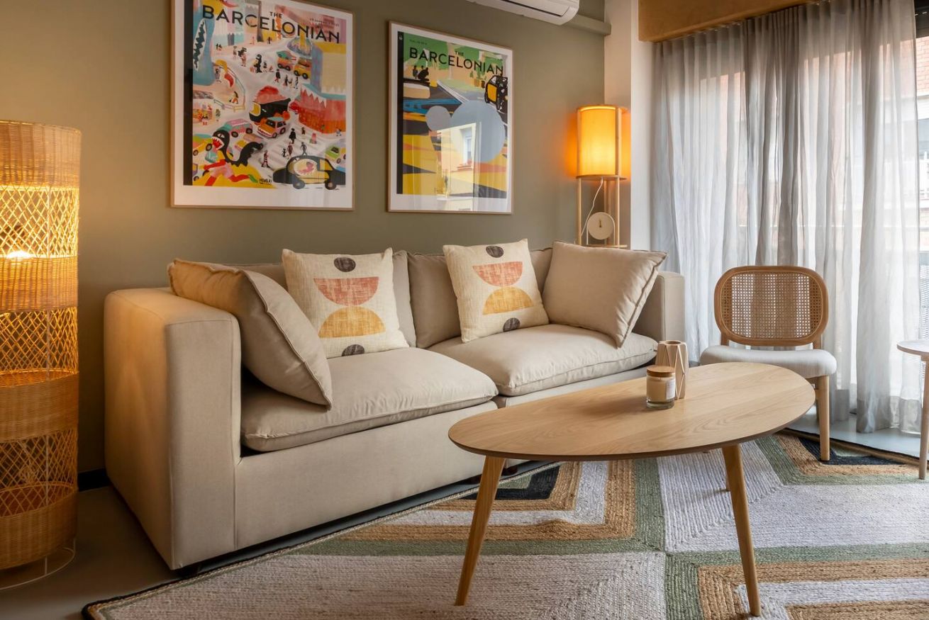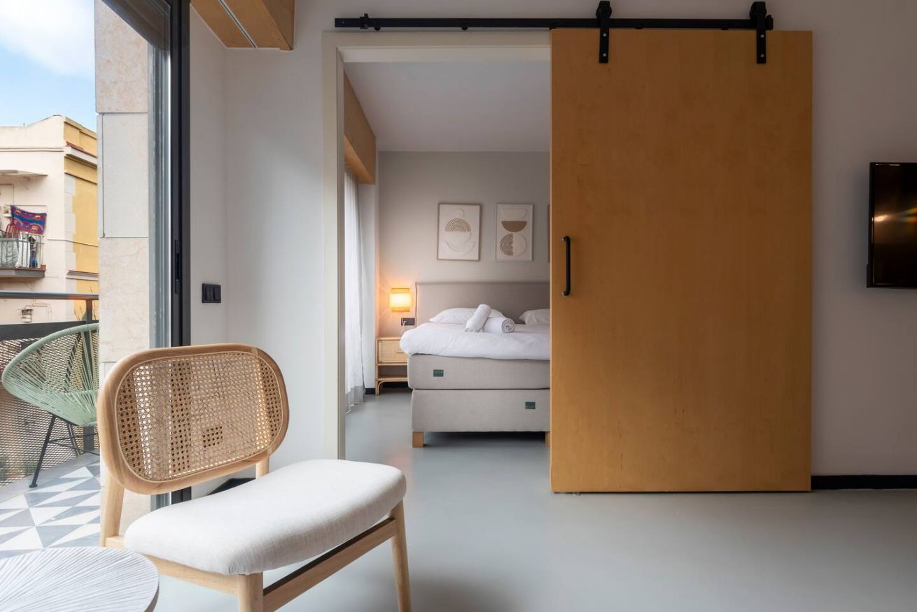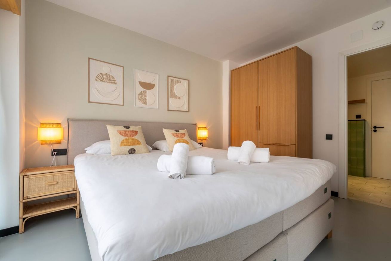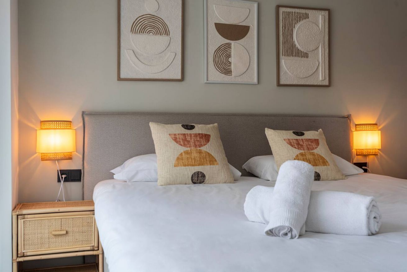 Este apartamento de 50 m² con un dormitorio tiene una cama doble, un baño, salón y cocina semiabierta completamente equipada. Combina un balcón privado con el disfrute comunal de un patio con piscina y zona chill out, ideal para nómadas corporativos o profesionales que necesitan espacios totalmente equipados y comodidades modernas. Máx. 2 huéspedes.