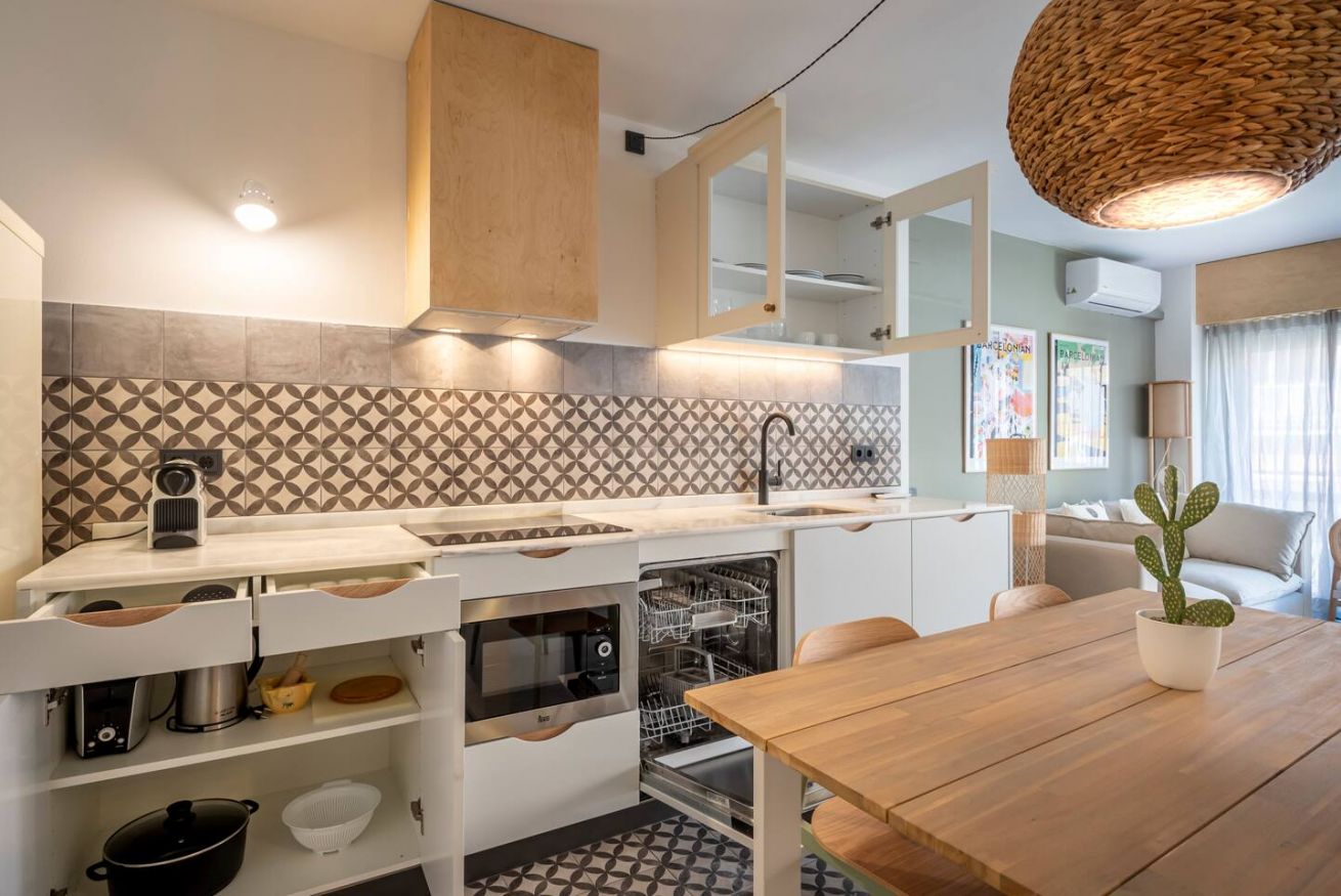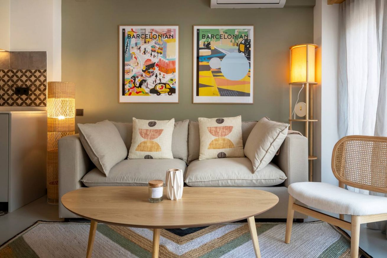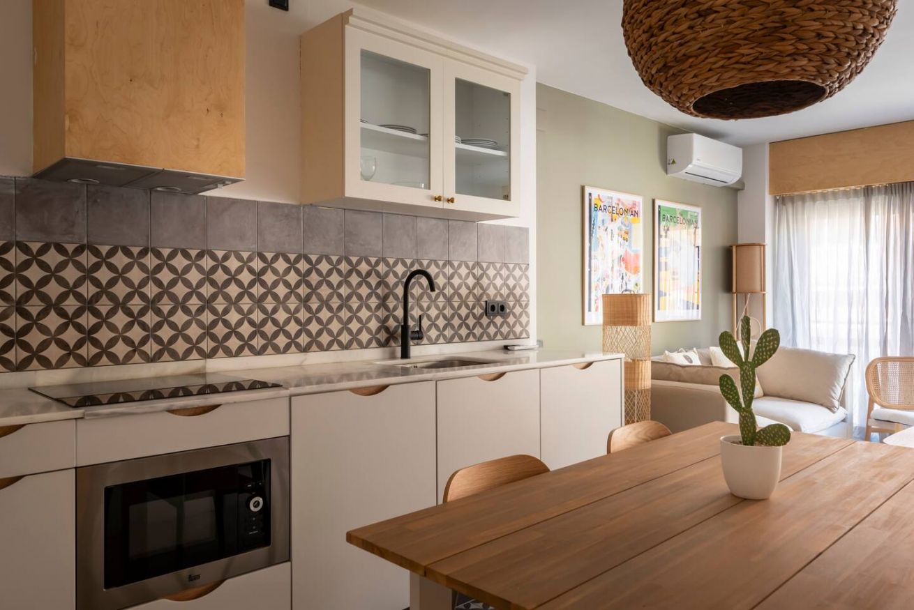 Este apartamento de 50 m² con un dormitorio tiene una cama doble, un baño, salón y cocina semiabierta completamente equipada. Combina un balcón privado con el disfrute comunal de un patio con piscina y zona chill out, ideal para nómadas corporativos o profesionales que necesitan espacios totalmente equipados y comodidades modernas. Máx. 2 huéspedes.