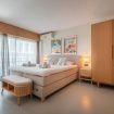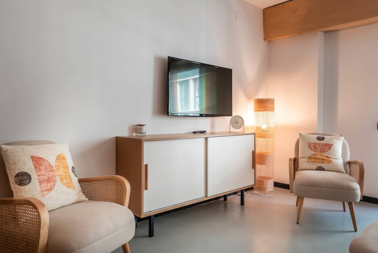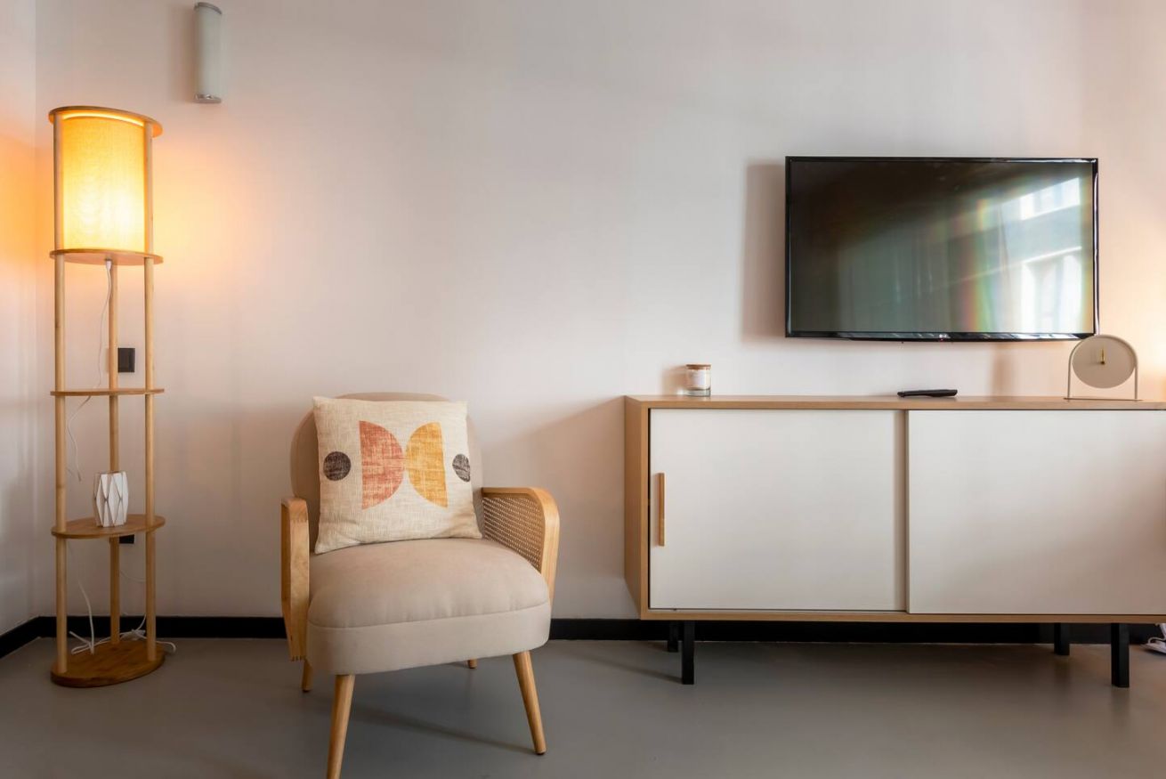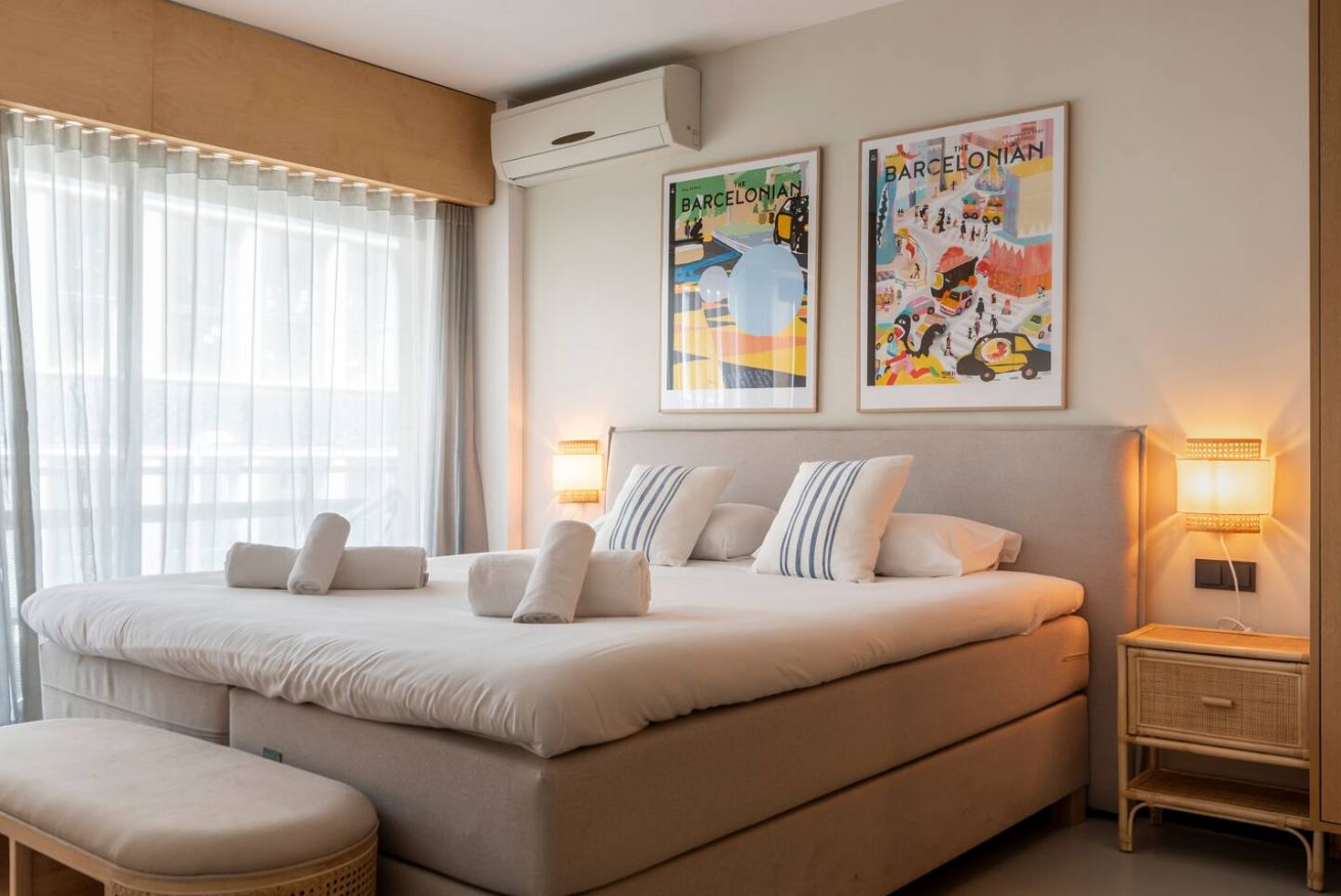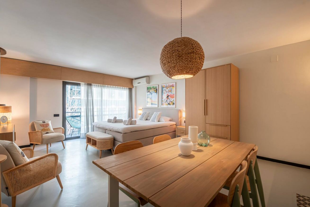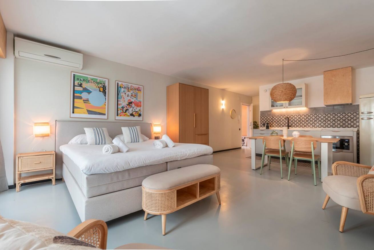 Este estudio de 45 m² tiene una cama doble, un baño, salón y cocina semiabierta completamente equipada. Combina un balcón privado con el disfrute comunal de un patio con piscina y zona chill out, ideal para nómadas corporativos o profesionales que necesitan espacios totalmente equipados y comodidades modernas. Máx. 2 huéspedes.